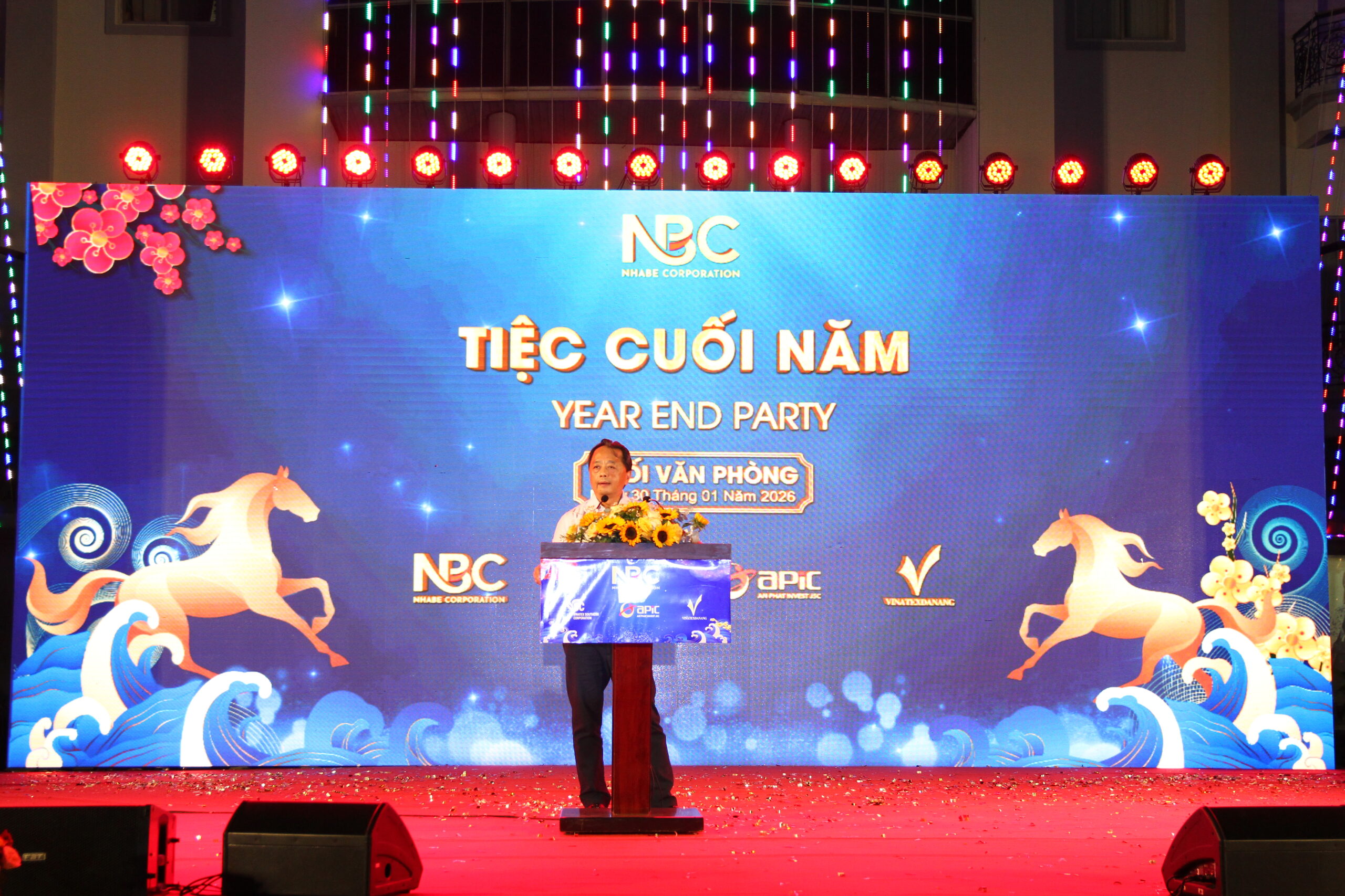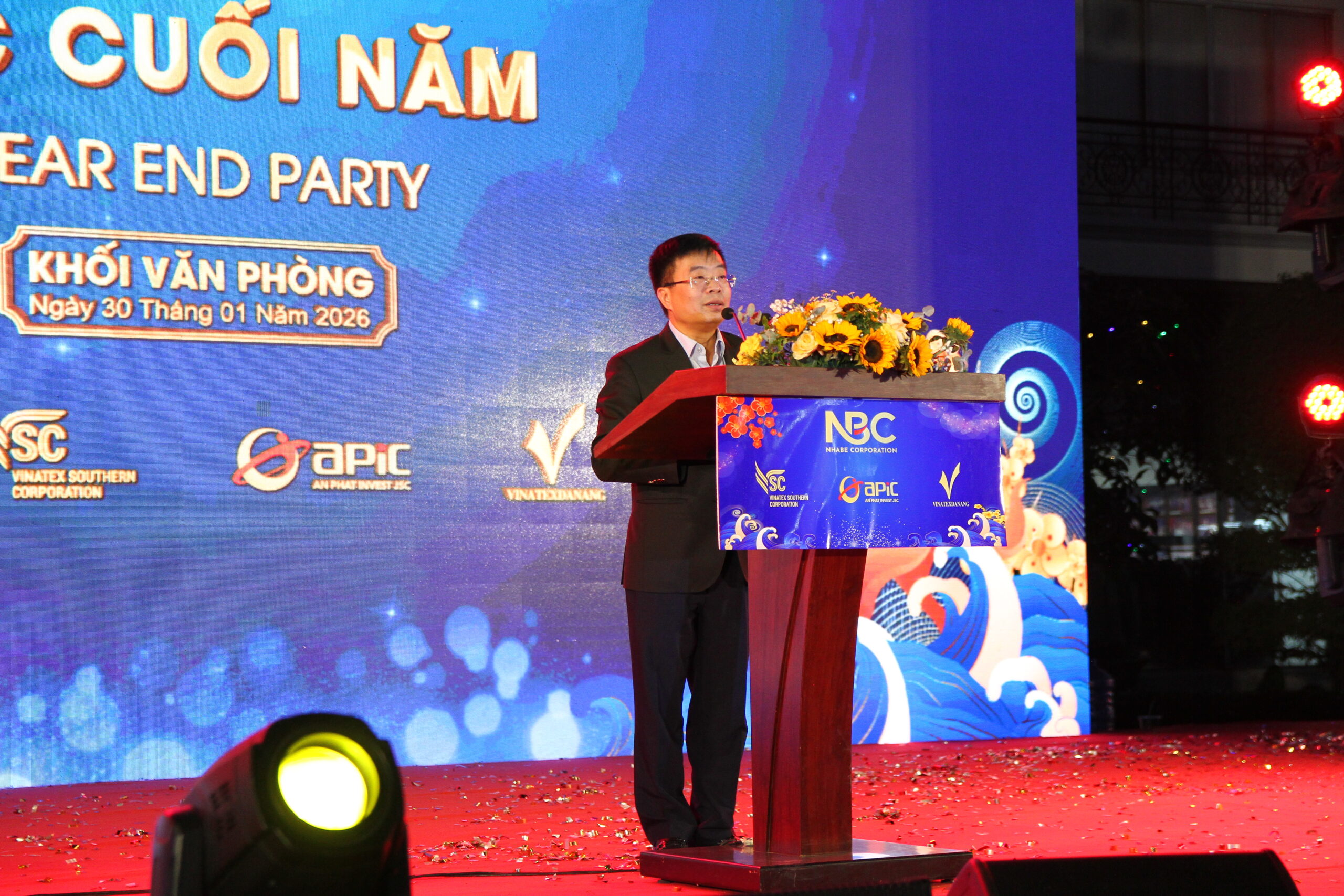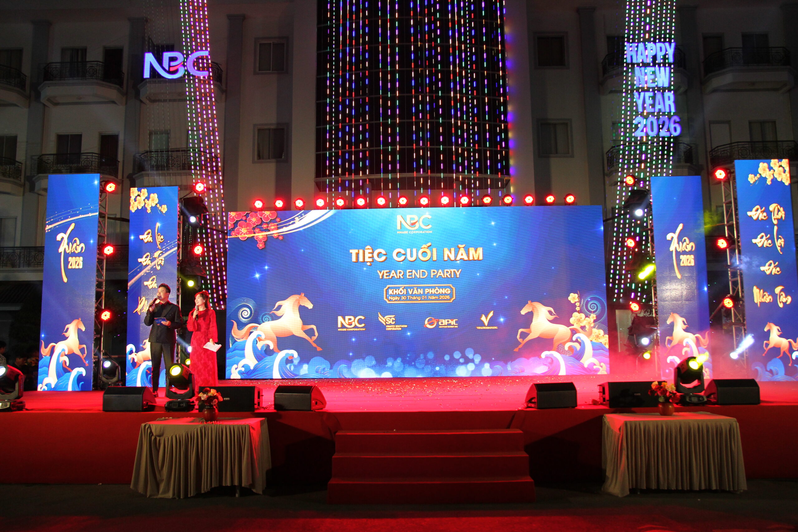 Tổng Công ty CP May Nhà Bè (NBC) đã tổ chức Tiệc Tất niên 2025 dành cho Khối Sản xuất và Khối Văn phòng của 4 hệ thống Tổng Công Ty: NBC – VSC – APIC – Vinatex Đà Nẵng, với sự tham dự của hơn 2.500 cán bộ, công nhân viên đến từ 4 hệ thống Tổng Công ty, Công ty con và Công ty liên kết tại khu vực TP.HCM. Chương trình được tổ chức trong hai ngày 28/01 & 30/01/2026, trong không khí ấm áp, thân tình và đầy ý nghĩa.